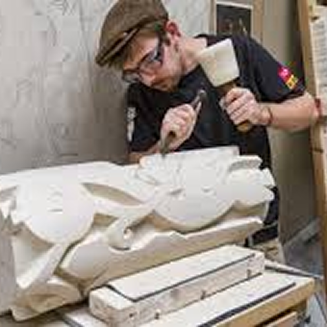 Intricate angel carving embracing a heart-shaped tablet.