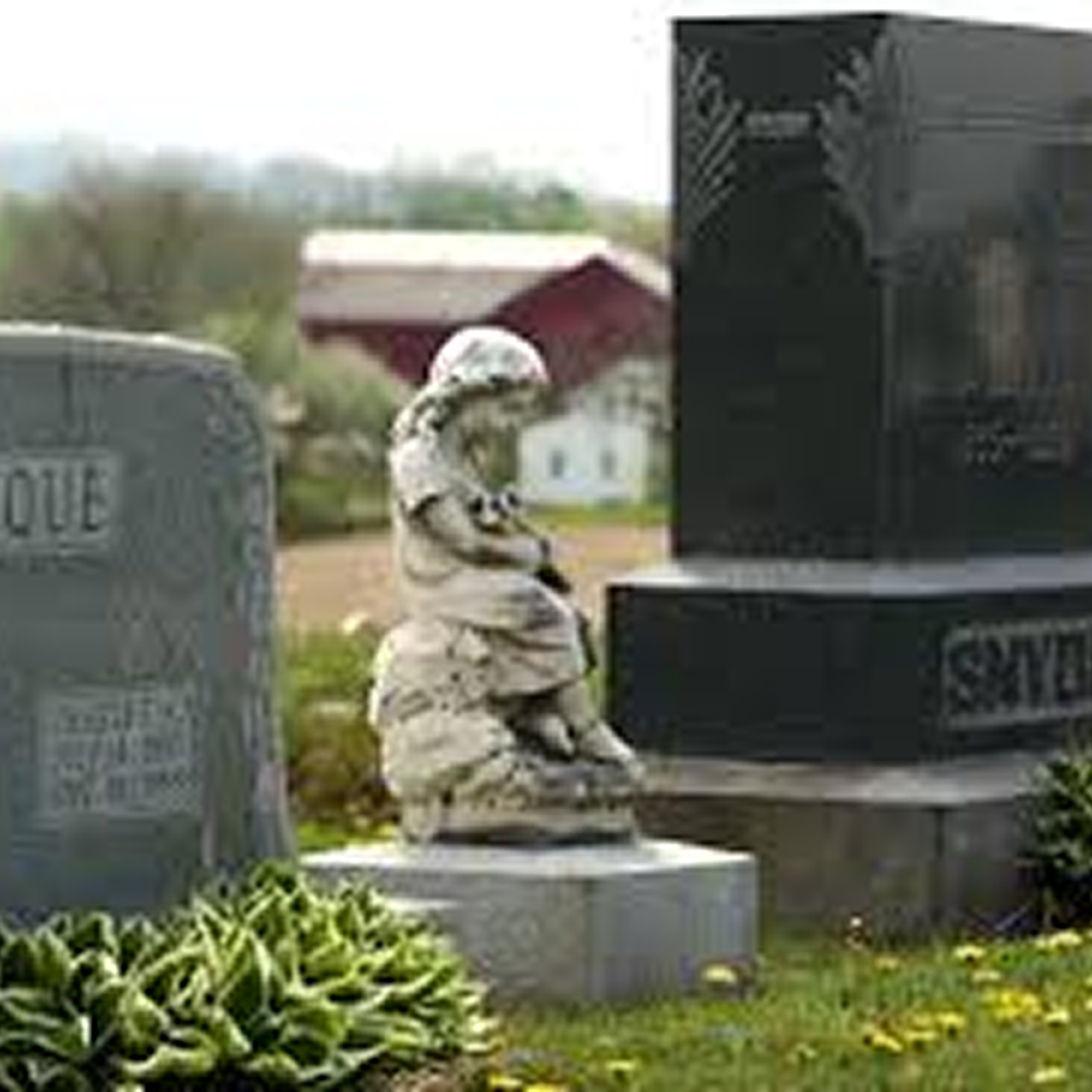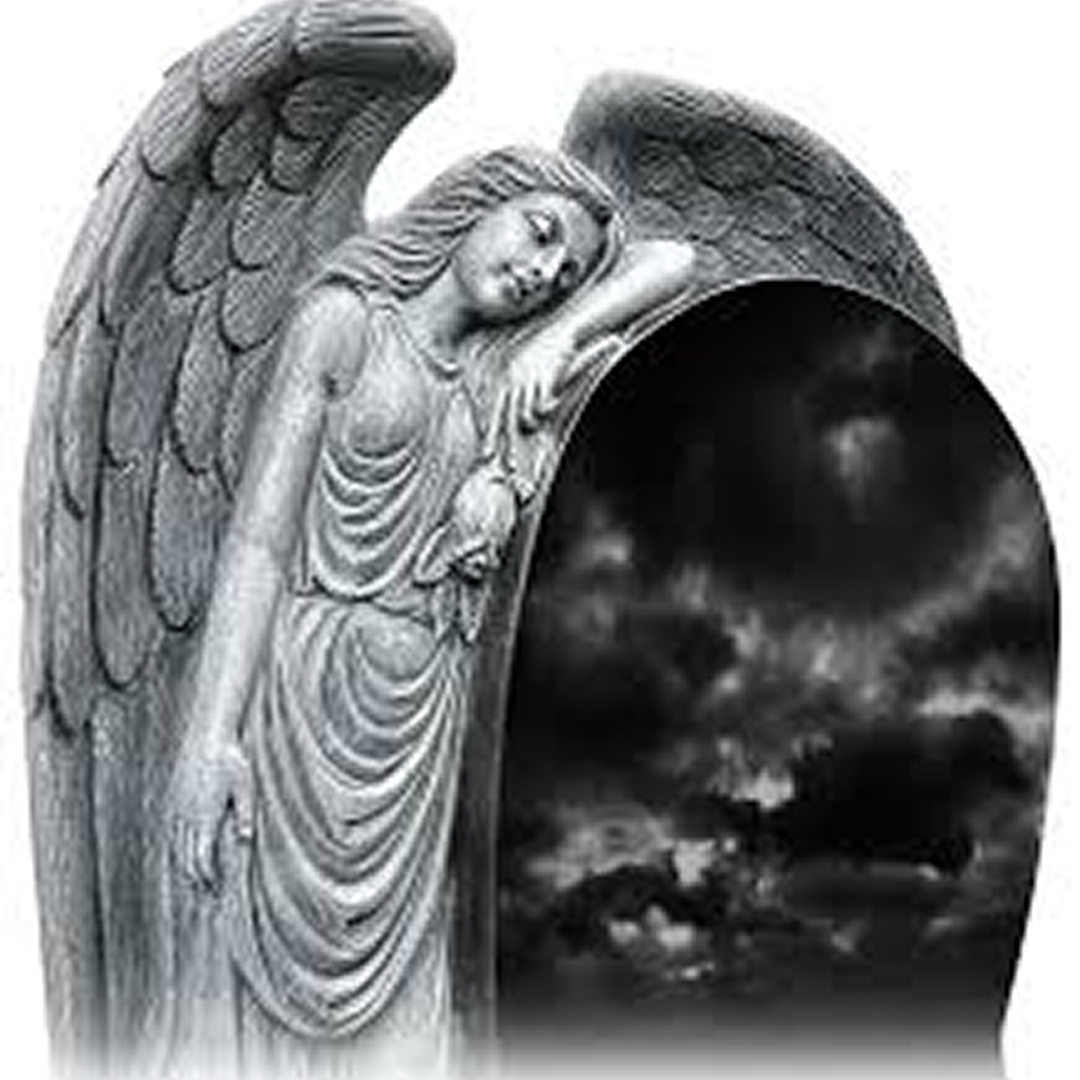 Hand-carved angel figure mourning over the headstone.